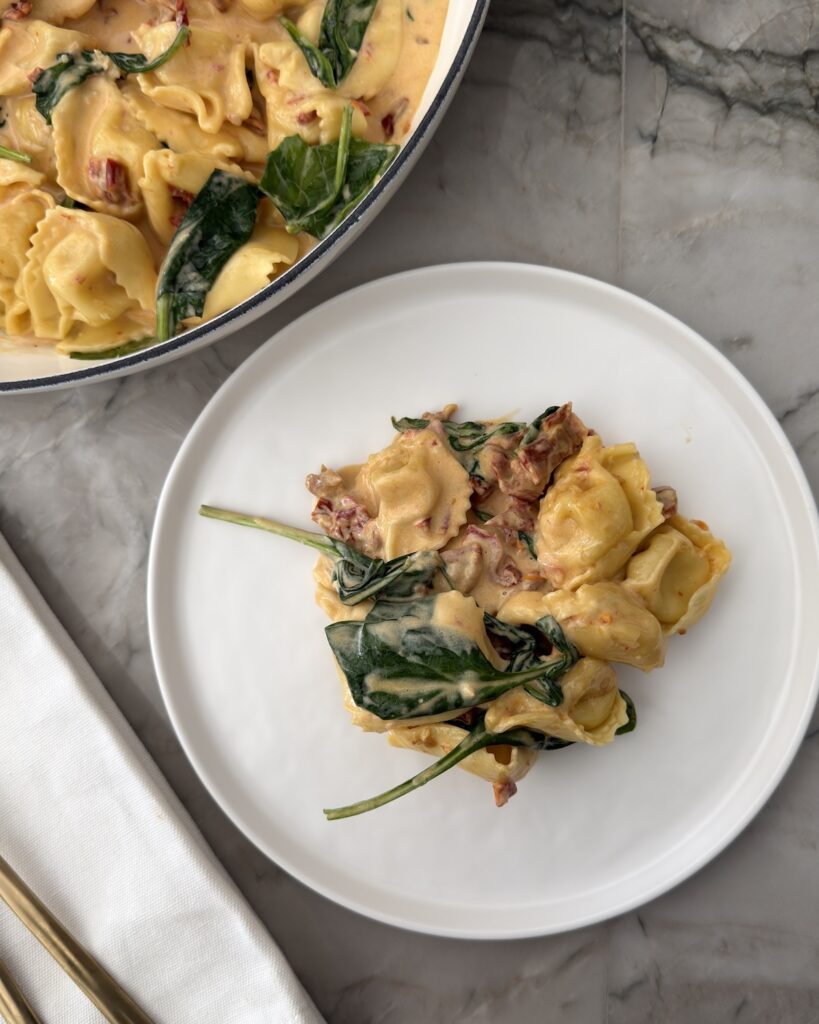 Easy to make in one pan, using simple ingredients and ready in under 30 minutes, Marry Me Tortellini is perfect for easy, yet elevated, weeknight dinners, date nights at home, or even entertaining guests with minimal effort. Turns out, cheesy tortellini paired with fresh spinach and juicy sun-dried tomatoes in a luxurious cream sauce is love at first bite.