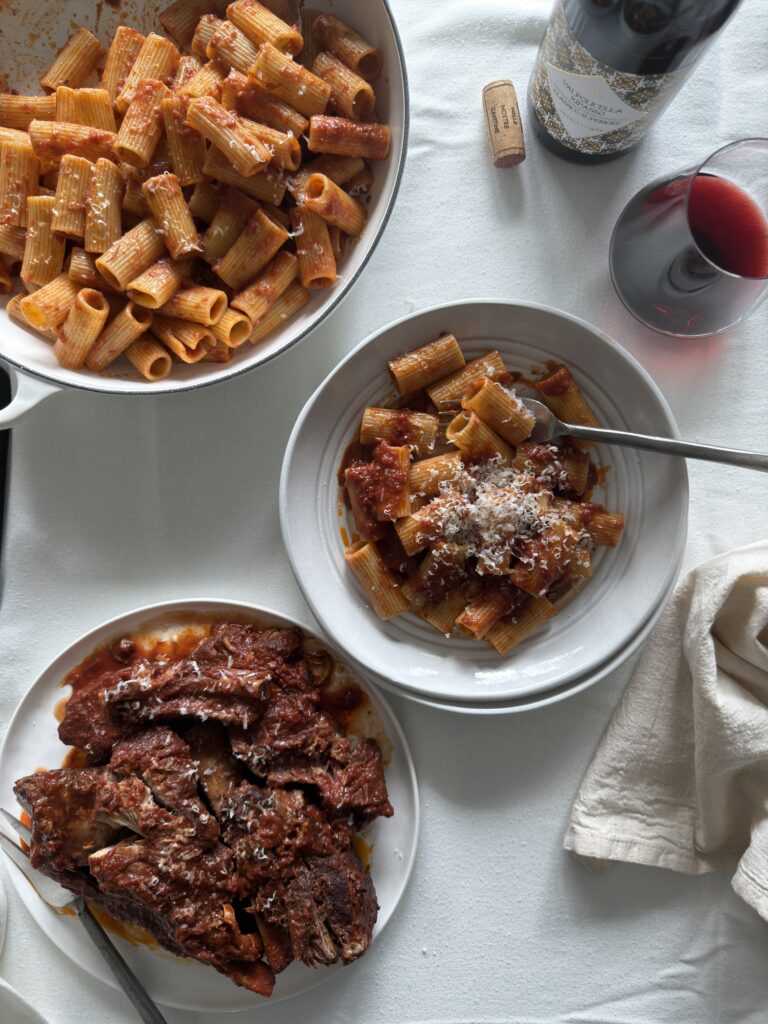 This Sunday sauce is a great make-ahead recipe, and you can start it in stages if that’s easier. If you want a head start, brown the short ribs and pork ribs, build the tomato base in the pot, then let everything cool and refrigerate overnight.